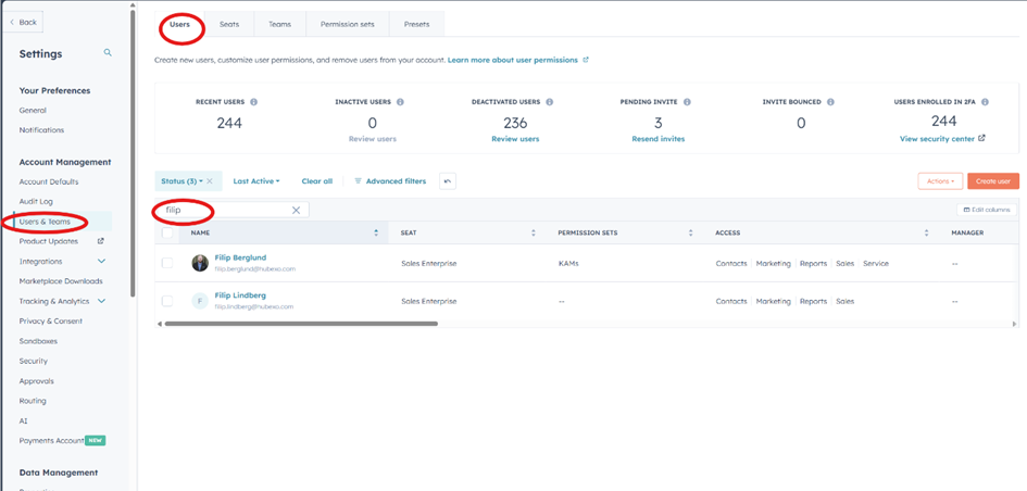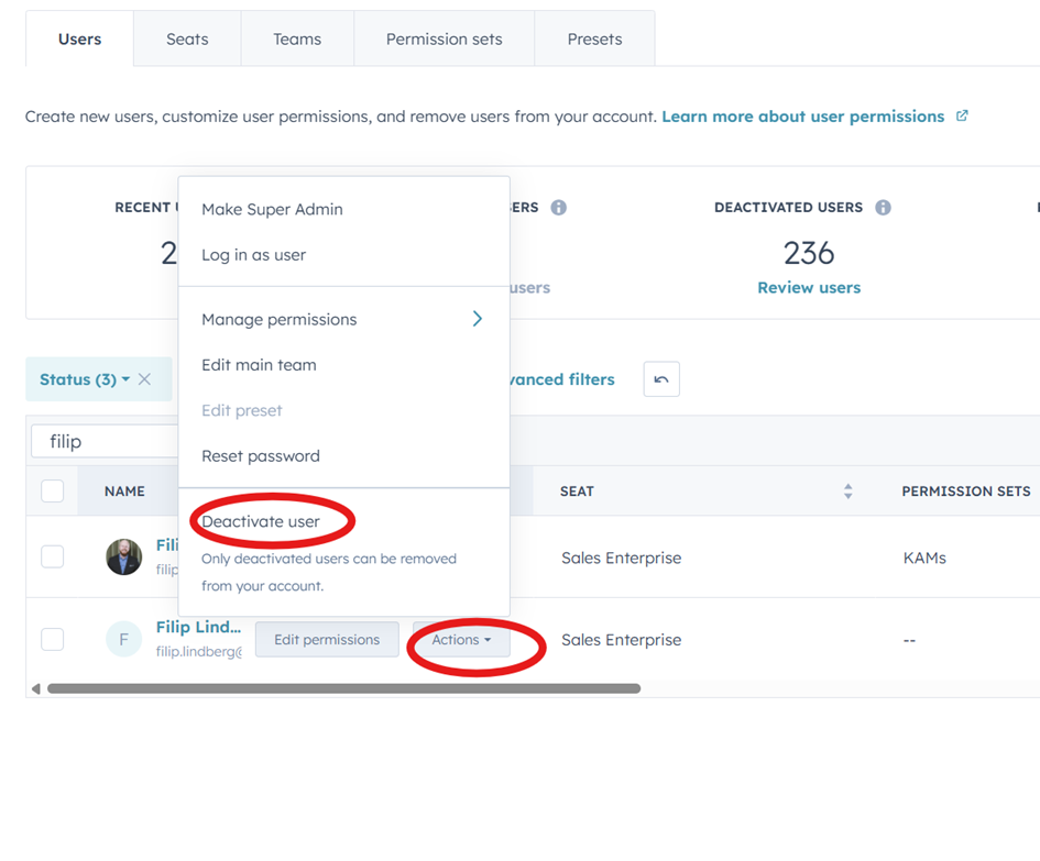 Click “Users & Teams” on the left toolbar, click on “users” and then search up the person that has “left the building”