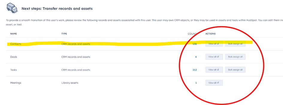 Then this will pop up and you can reassign deals, tasks and meetings, by bulk assign them or you can go trough them one by one.