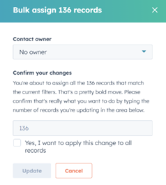 One the first one, Contacts, you can choose “bulk assign all” and then leave the Contact owner to “no owner” as we do not work with "contacts", but "company owner".