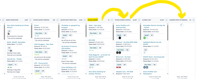 Normally, an order should automatically move from “Quote signed” to “Myran order completed” every night at midnight — but that’s not happening right now.