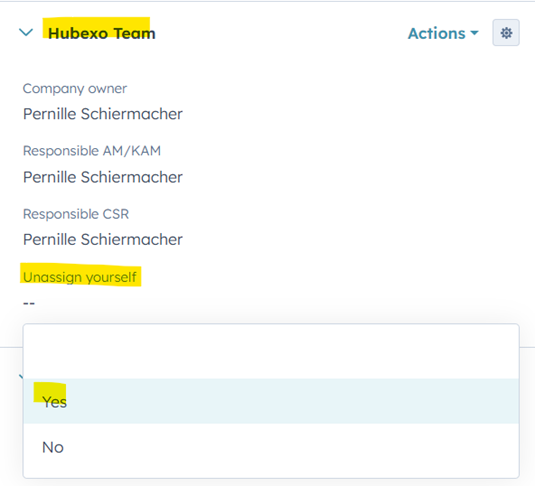 Reassign as company owner In order for a sales rep to remove themselves as the company owner, an additional field has been added under “Hubexo Team” where they can check “Yes” if they are no longer responsible for that company.